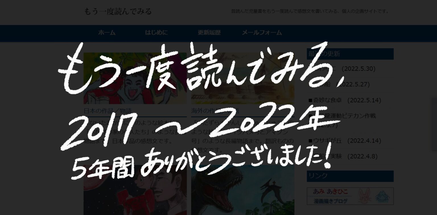 2017年から5年間、 記事の挿絵を担当してきた sacorama様の児童書紹介サイト 「もう一度読んでみる」が 最終回を迎えました! 「もう一度読んでみる」おわりに ↓ http://sacorama.web.fc2.com/rereading/ending.html 「もう一度読んでみる」開設時の私のブログ記事↓ http://blog.livedoor.jp/amiakihik … 続きを読む 2017年からイラストを担当した「もう一度読んでみる」が最終回
